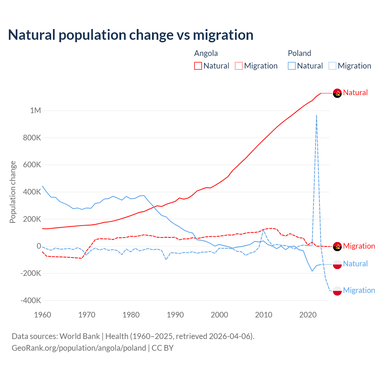 Over the last 10 years, 95.5% of the population change in Angola is from natural causes (a gain of 10,163,567 people) and 4.54% is from migration (a gain of 483,327 people). In Poland 41.4% is from natural causes (a loss of 675,443 people) and 58.6% is from migration (a gain of 955,766 people).
