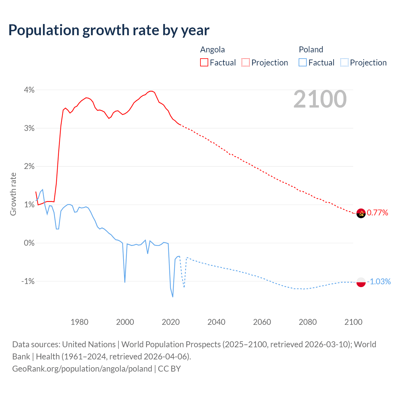 - For the last 10 years, Angola has had an average growth rate of +3.42% per year vs -0.36% in Poland.