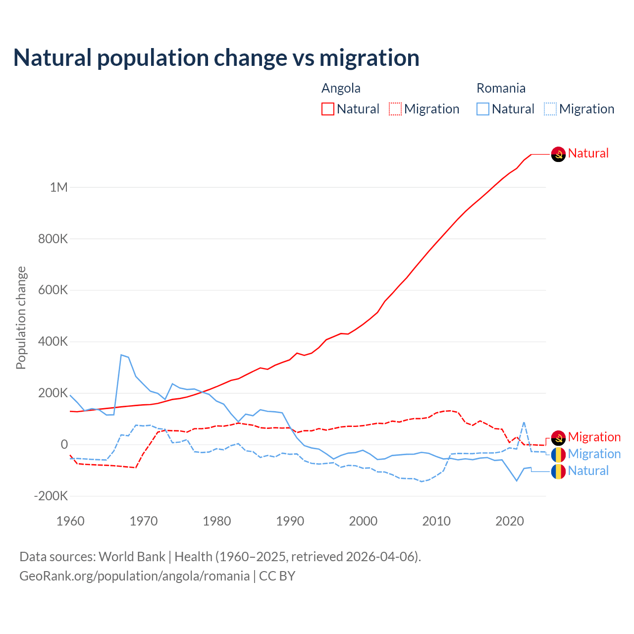 Over the last 10 years, 95.5% of the population change in Angola is from natural causes (a gain of 10,163,567 people) and 4.54% is from migration (a gain of 483,327 people). In Romania 82% is from natural causes (a loss of 766,295 people) and 18% is from migration (a loss of 167,917 people).