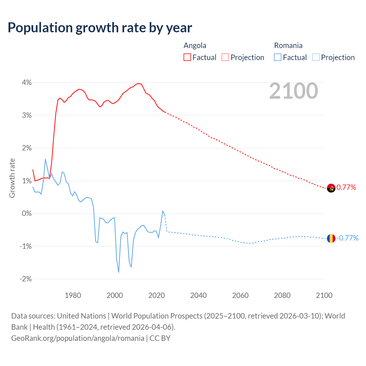 - For the last 10 years, Angola has had an average growth rate of +3.42% per year vs -0.43% in Romania.