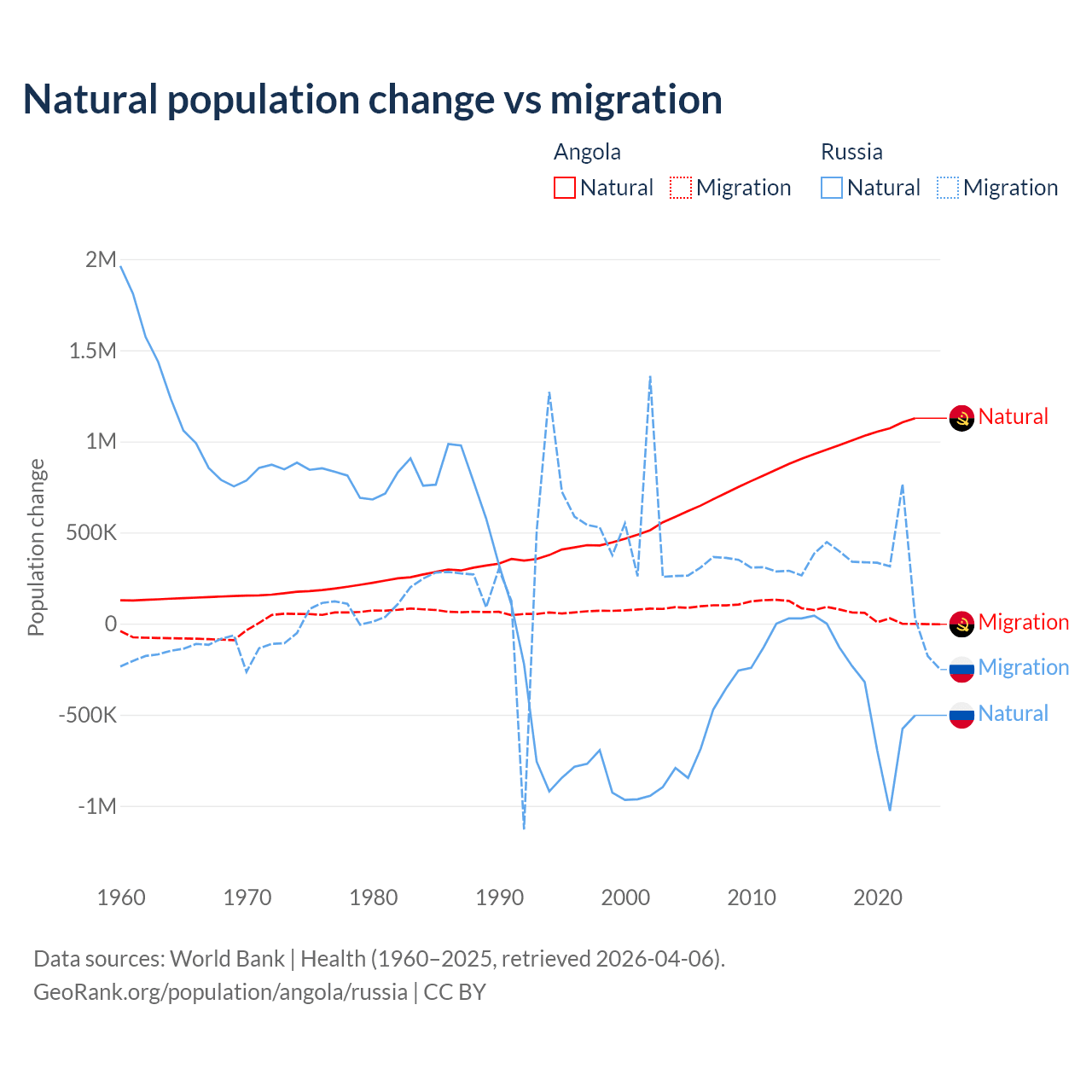Over the last 10 years, 95.5% of the population change in Angola is from natural causes (a gain of 10,163,567 people) and 4.54% is from migration (a gain of 483,327 people). In Russia 48.6% is from natural causes (a loss of 3,416,377 people) and 51.4% is from migration (a gain of 3,611,826 people).