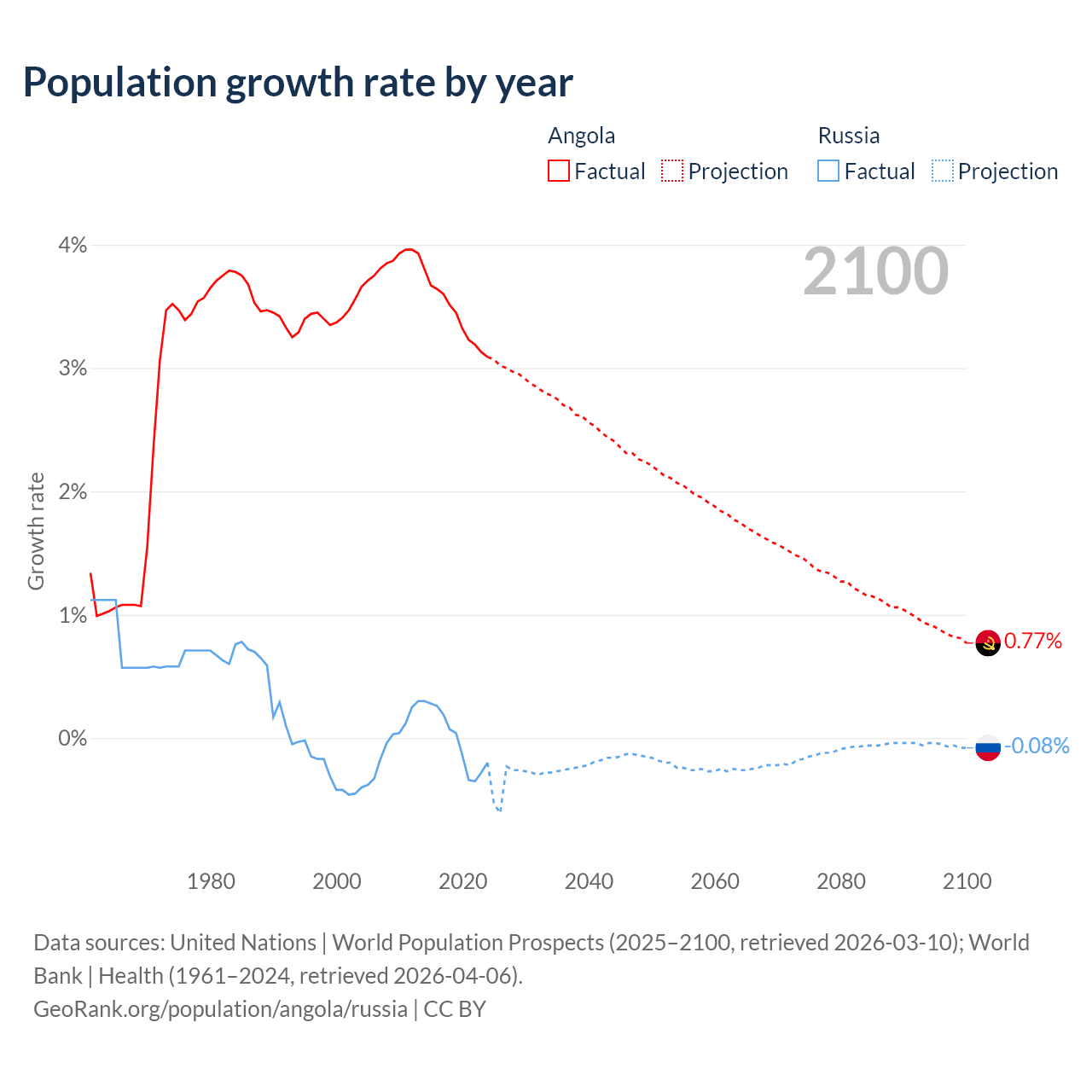 - For the last 10 years, Angola has had an average growth rate of +3.42% per year vs -0.02% in Russia.