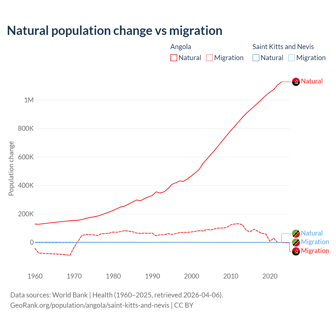 Over the last 10 years, 95.5% of the population change in Angola is from natural causes (a gain of 10,163,567 people) and 4.54% is from migration (a gain of 483,327 people). In Saint Kitts and Nevis 44.9% is from natural causes (a gain of 1,225 people) and 55.1% is from migration (a loss of 1,506 people).