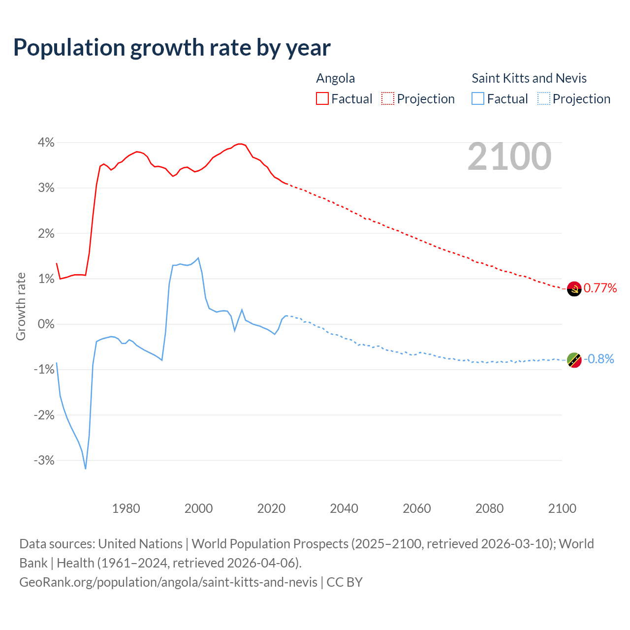 - For the last 10 years, Angola has had an average growth rate of +3.42% per year vs -0.04% in Saint Kitts and Nevis.