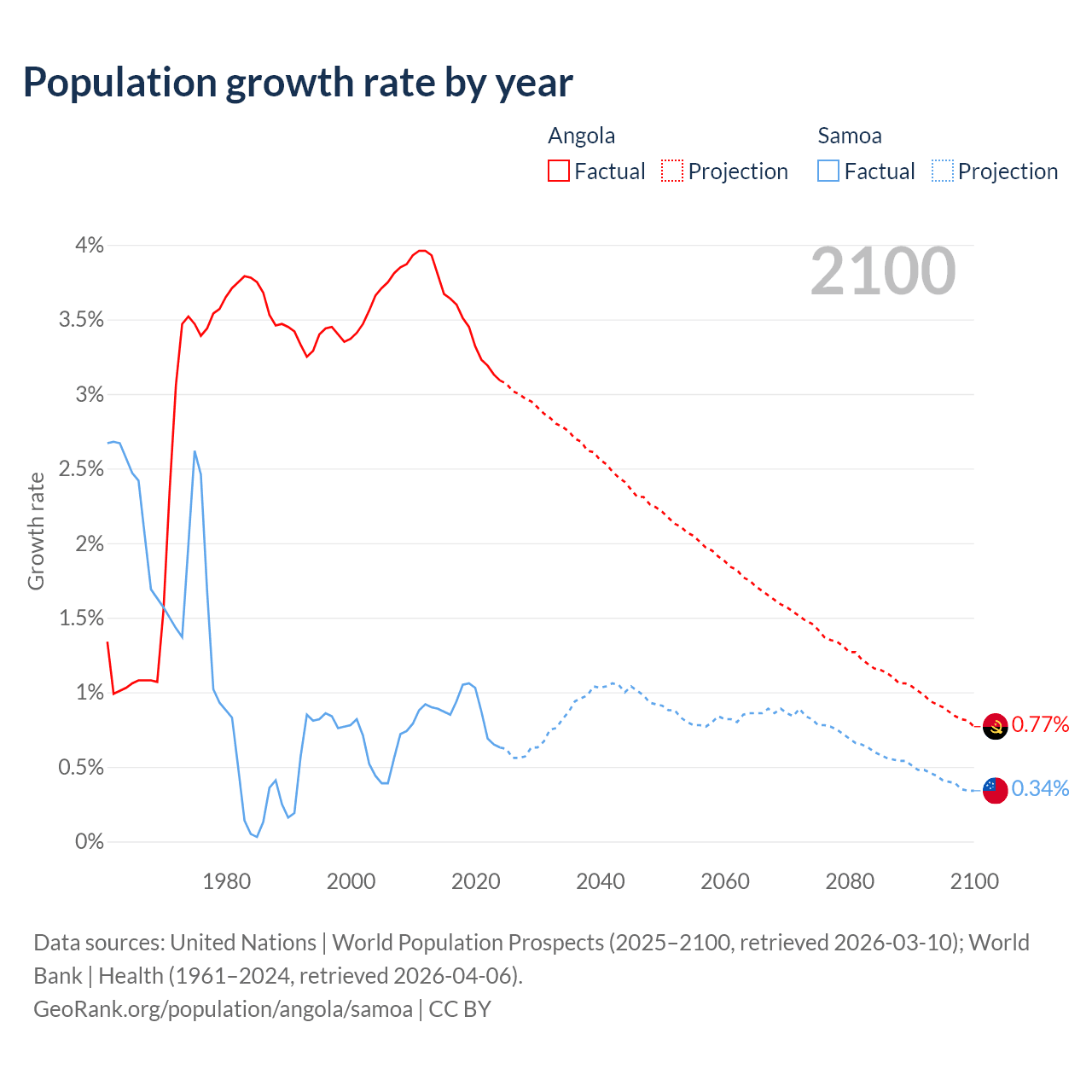 - For the last 10 years, Angola has had an average growth rate of +3.42% per year vs +0.87% in Samoa.