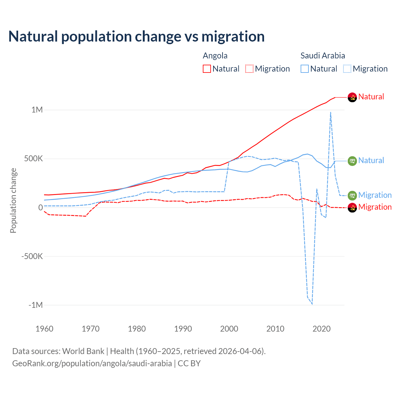 Over the last 10 years, 95.5% of the population change in Angola is from natural causes (a gain of 10,163,567 people) and 4.54% is from migration (a gain of 483,327 people). In Saudi Arabia 93.9% is from natural causes (a gain of 4,829,562 people) and 6.05% is from migration (a gain of 311,209 people).