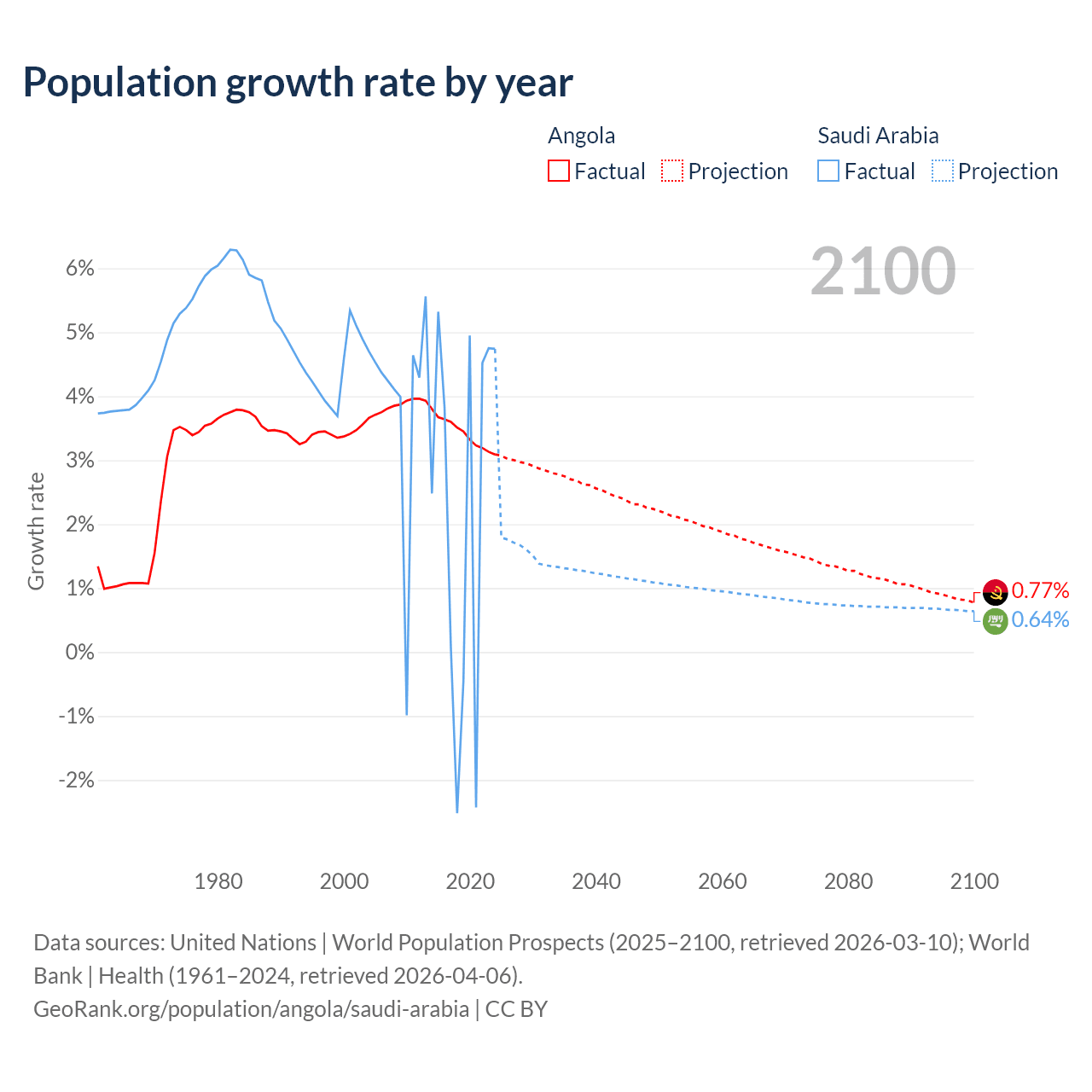 - For the last 10 years, Angola has had an average growth rate of +3.42% per year vs +2.3% in Saudi Arabia.
