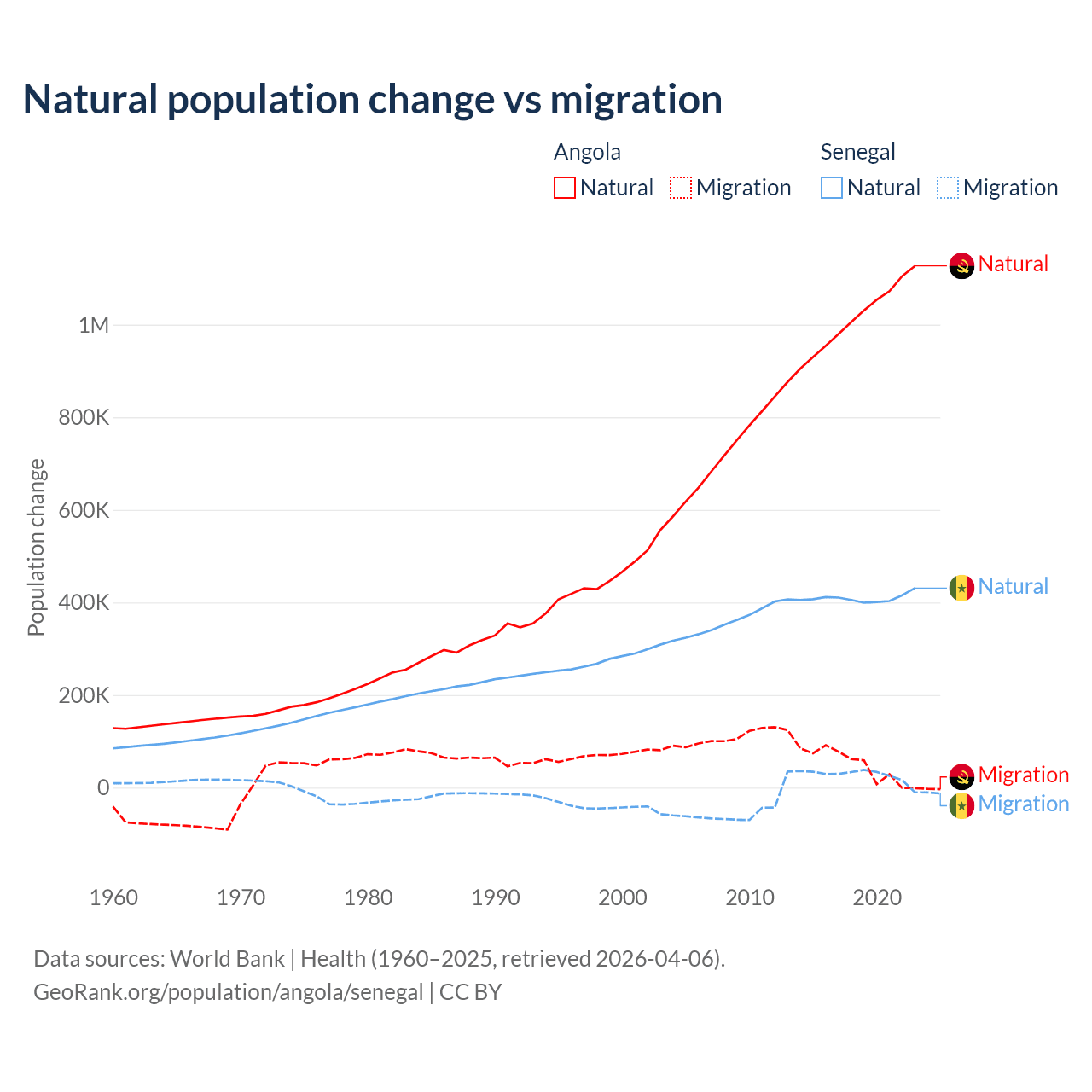 Over the last 10 years, 95.5% of the population change in Angola is from natural causes (a gain of 10,163,567 people) and 4.54% is from migration (a gain of 483,327 people). In Senegal 93.9% is from natural causes (a gain of 4,089,205 people) and 6.13% is from migration (a gain of 267,266 people).
