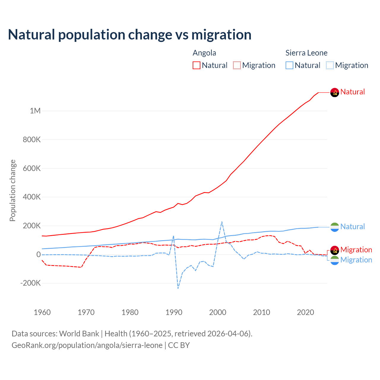 Over the last 10 years, 95.5% of the population change in Angola is from natural causes (a gain of 10,163,567 people) and 4.54% is from migration (a gain of 483,327 people). In Sierra Leone 99.6% is from natural causes (a gain of 1,764,049 people) and 0.41% is from migration (a loss of 7,211 people).