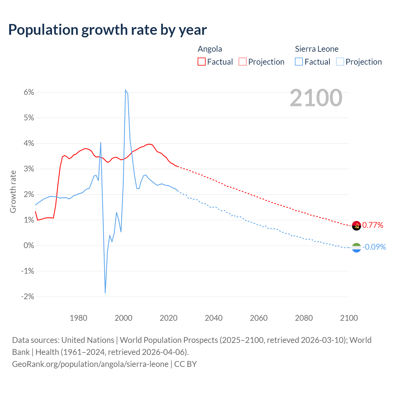 - For the last 10 years, Angola has had an average growth rate of +3.42% per year vs +2.32% in Sierra Leone.