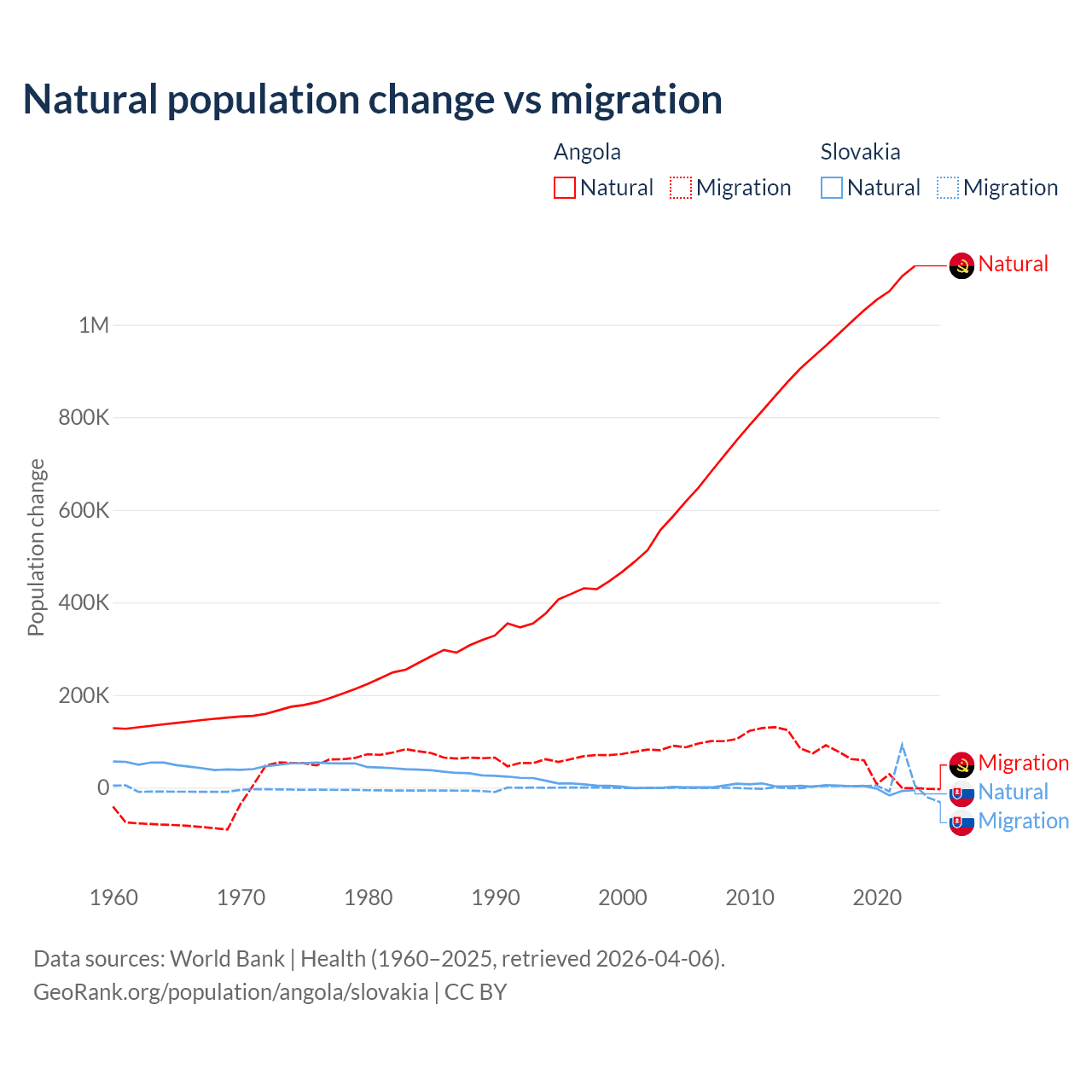 Over the last 10 years, 95.5% of the population change in Angola is from natural causes (a gain of 10,163,567 people) and 4.54% is from migration (a gain of 483,327 people). In Slovakia 7.47% is from natural causes (a loss of 8,728 people) and 92.5% is from migration (a gain of 108,156 people).