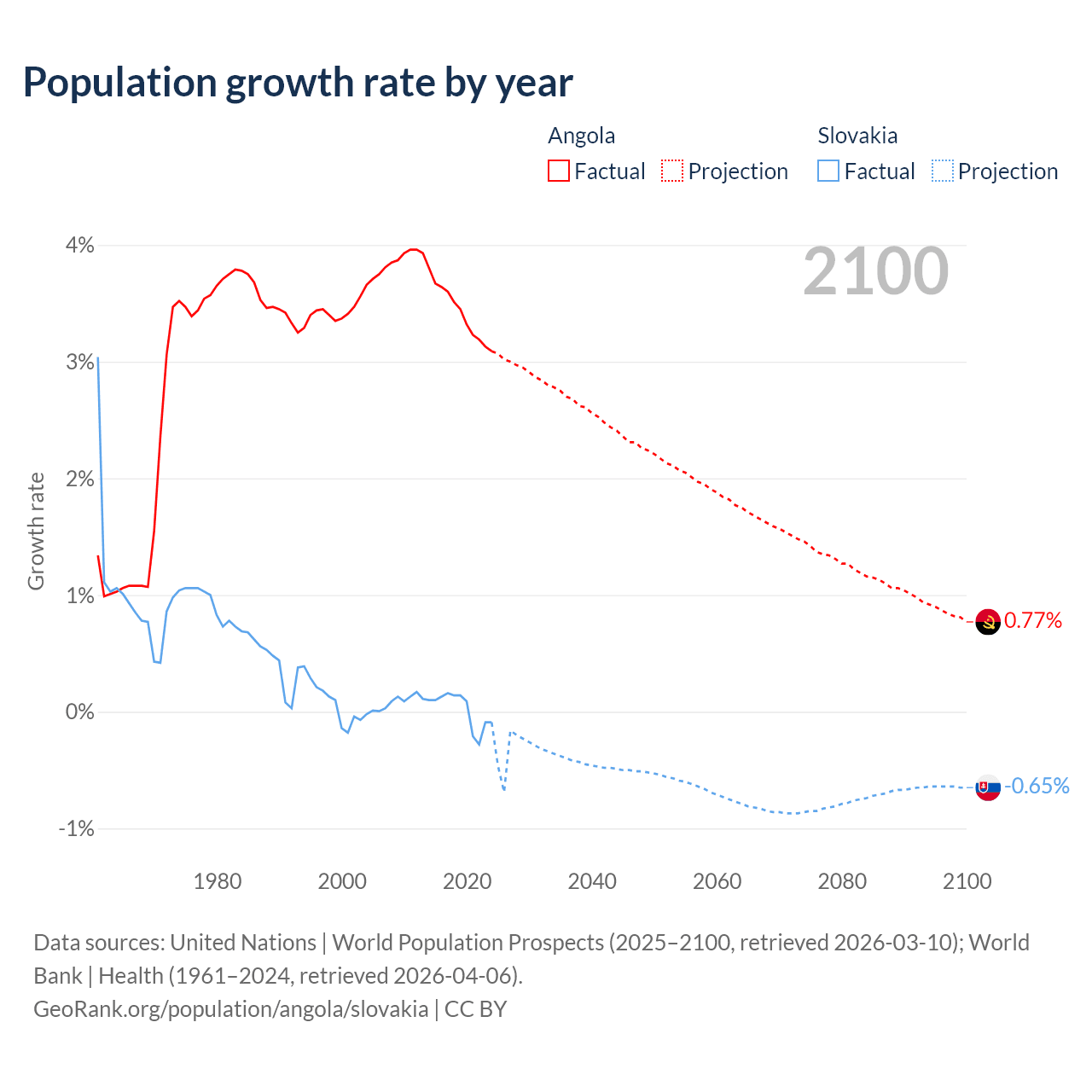 - For the last 10 years, Angola has had an average growth rate of +3.42% per year vs +0.01% in Slovakia.