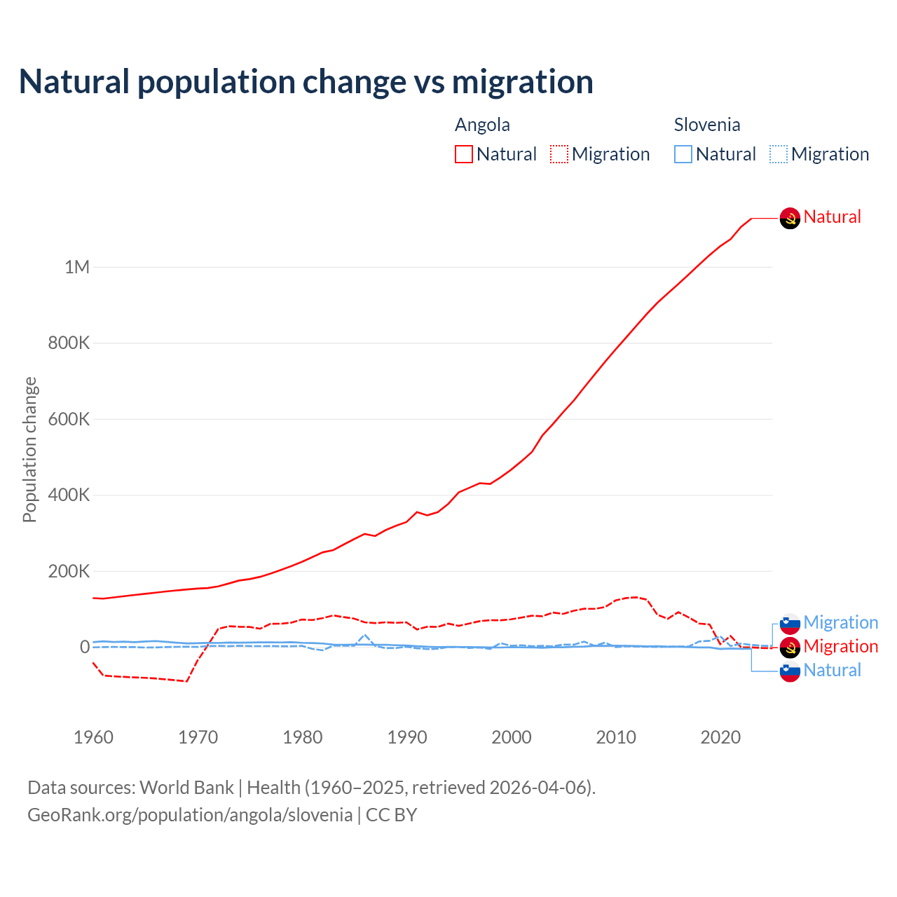 Over the last 10 years, 95.5% of the population change in Angola is from natural causes (a gain of 10,163,567 people) and 4.54% is from migration (a gain of 483,327 people). In Slovenia 18.1% is from natural causes (a loss of 17,573 people) and 81.9% is from migration (a gain of 79,532 people).