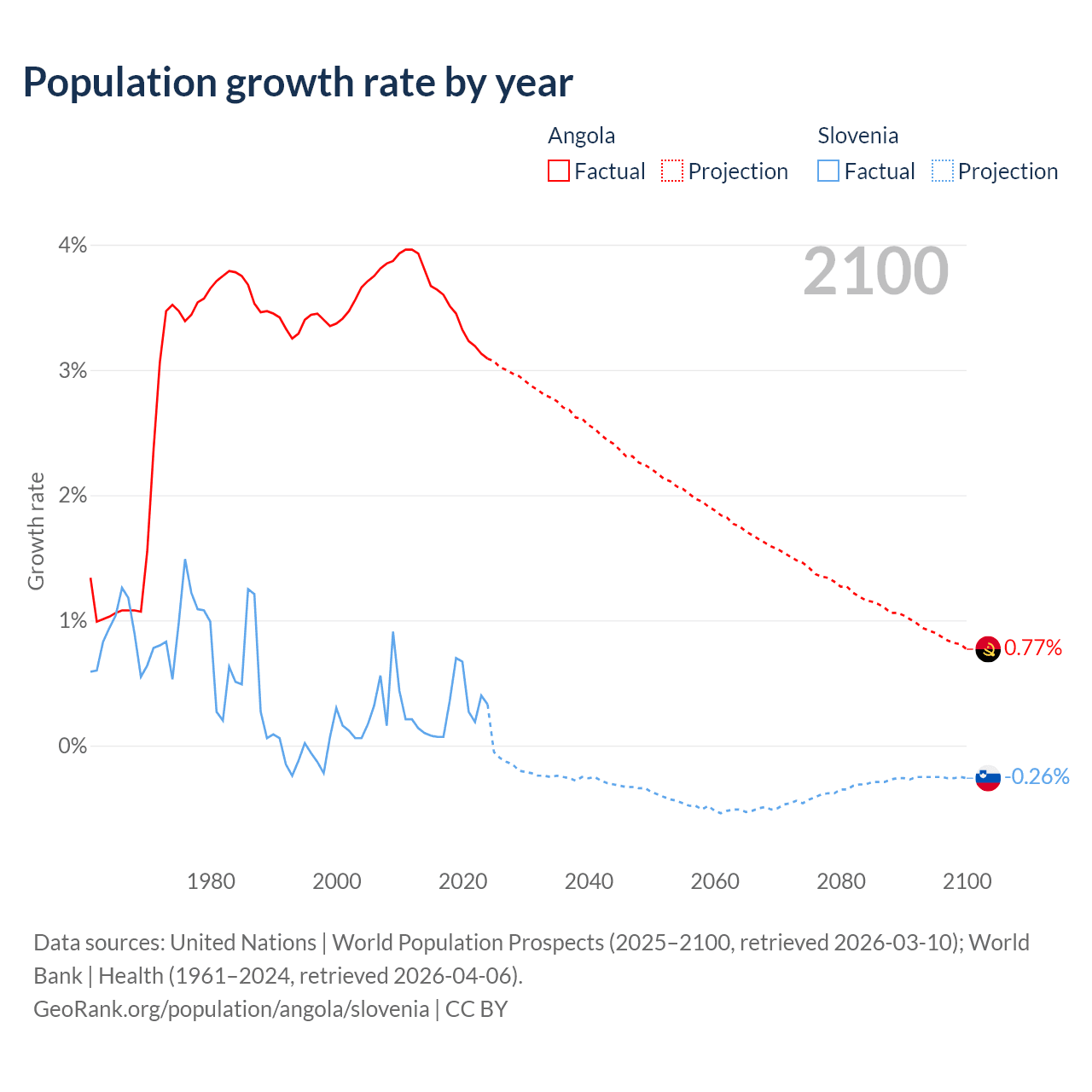 - For the last 10 years, Angola has had an average growth rate of +3.42% per year vs +0.29% in Slovenia.