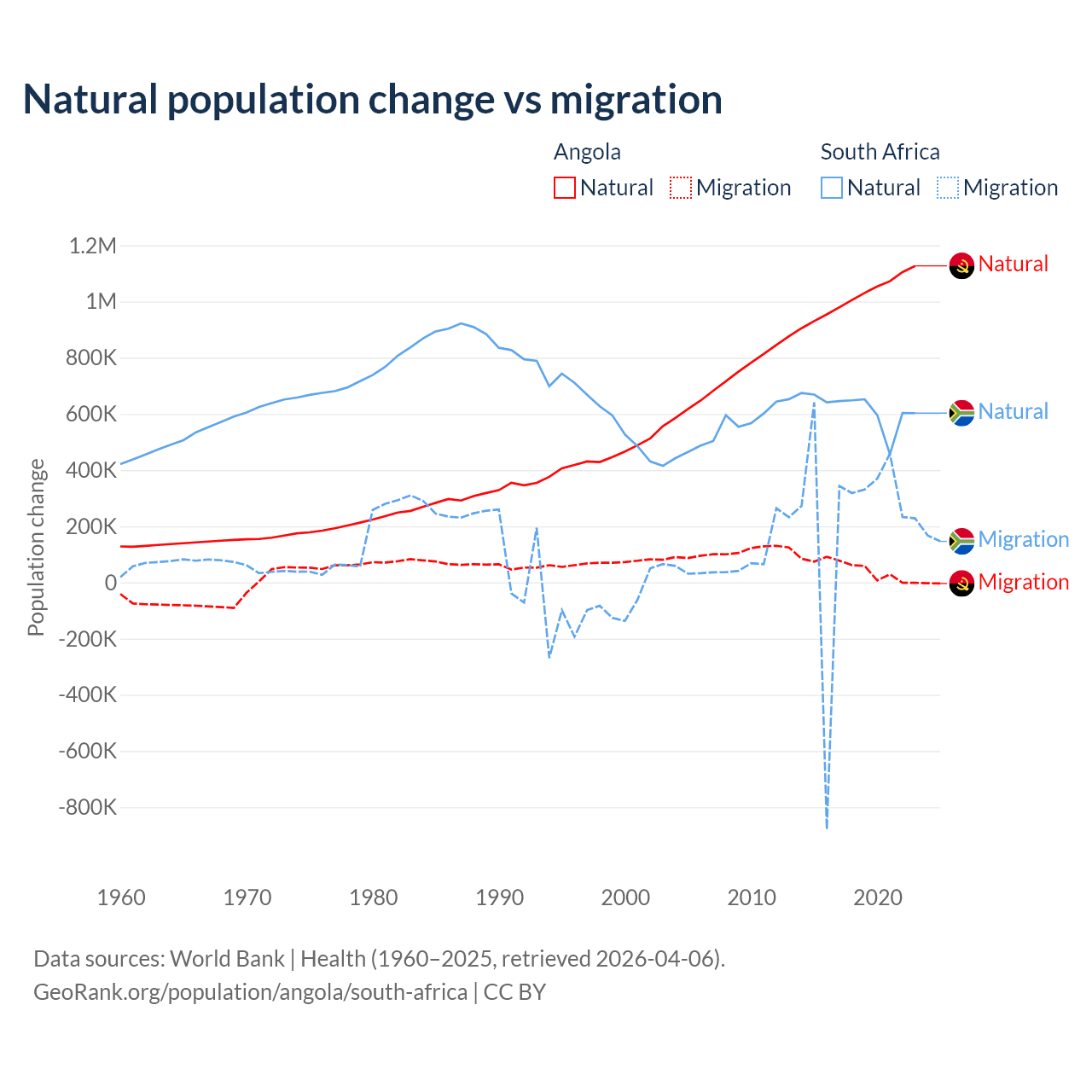 Over the last 10 years, 95.5% of the population change in Angola is from natural causes (a gain of 10,163,567 people) and 4.54% is from migration (a gain of 483,327 people). In South Africa 72.8% is from natural causes (a gain of 6,190,027 people) and 27.2% is from migration (a gain of 2,316,795 people).