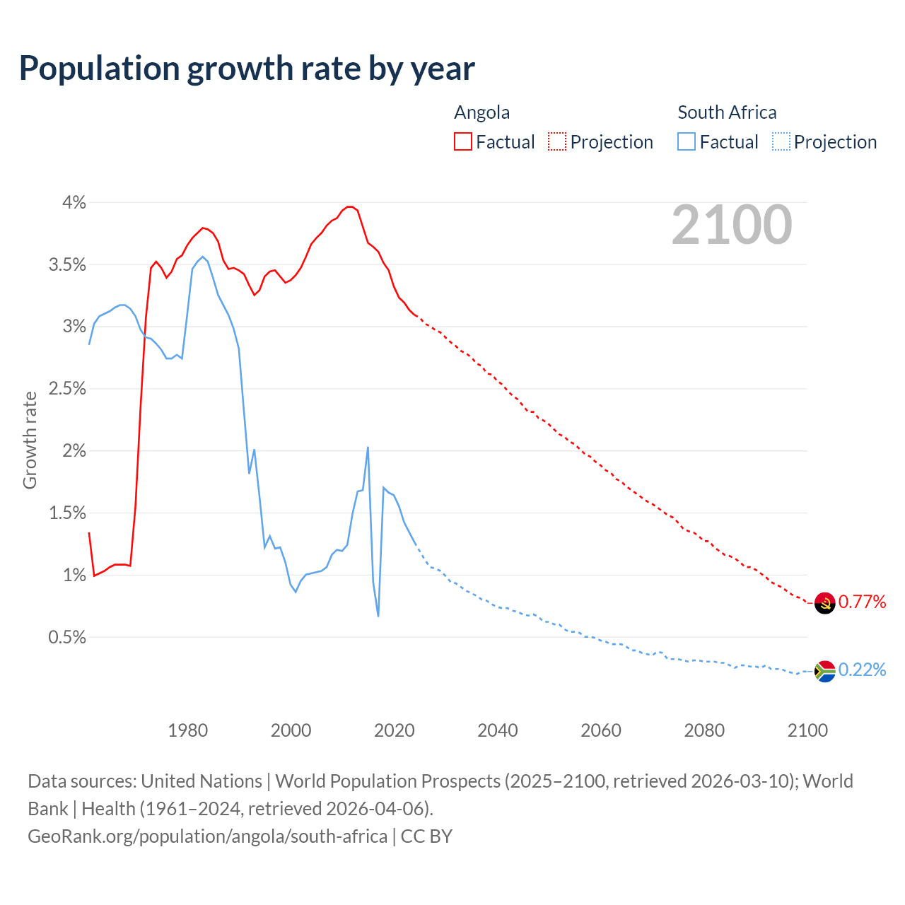 Data sources: World Bank | Health (1960–2024, retrieved 2026-04-06); United Nations | World Population Prospects (1960–2026, retrieved 2026-03-10); U.S. Census Bureau (1960–2025, retrieved 2026-02-08); Central Intelligence Agency (CIA) (2000–2019, retrieved 2026-02-20).