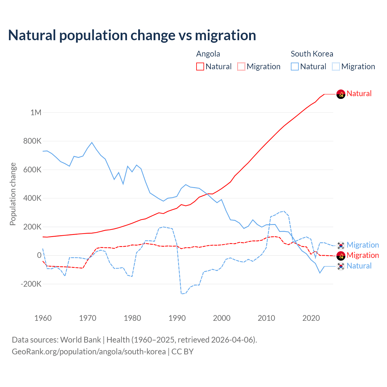 Over the last 10 years, 95.5% of the population change in Angola is from natural causes (a gain of 10,163,567 people) and 4.54% is from migration (a gain of 483,327 people). In South Korea 17.6% is from natural causes (a gain of 277,215 people) and 82.4% is from migration (a gain of 1,298,356 people).