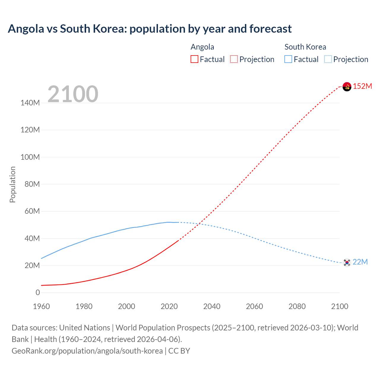 Angola vs South Korea: population by year and forecast