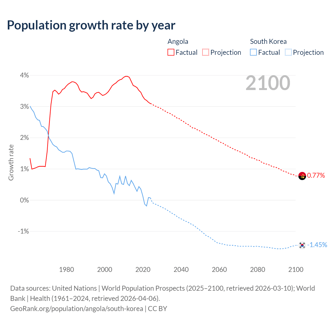 - For the last 10 years, Angola has had an average growth rate of +3.42% per year vs +0.24% in South Korea.