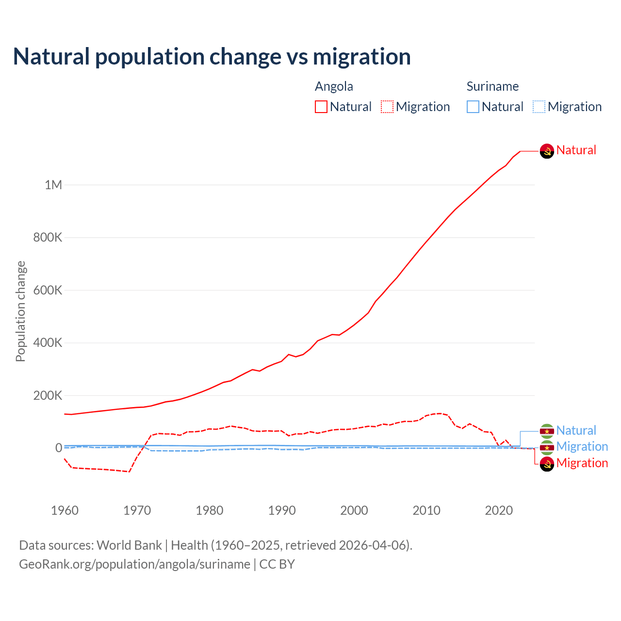 Over the last 10 years, 95.5% of the population change in Angola is from natural causes (a gain of 10,163,567 people) and 4.54% is from migration (a gain of 483,327 people). In Suriname 90.3% is from natural causes (a gain of 66,709 people) and 9.72% is from migration (a loss of 7,185 people).