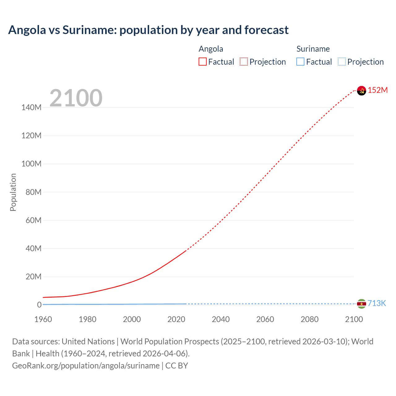 The latest officially reported population of Angola was 37,885,849 in 2024 vs 634,431 people in Suriname in 2024. In 2026, based on the adjusted UN estimation, the current Angola's population is 40,555,924 people compared to 646,767 in Suriname.