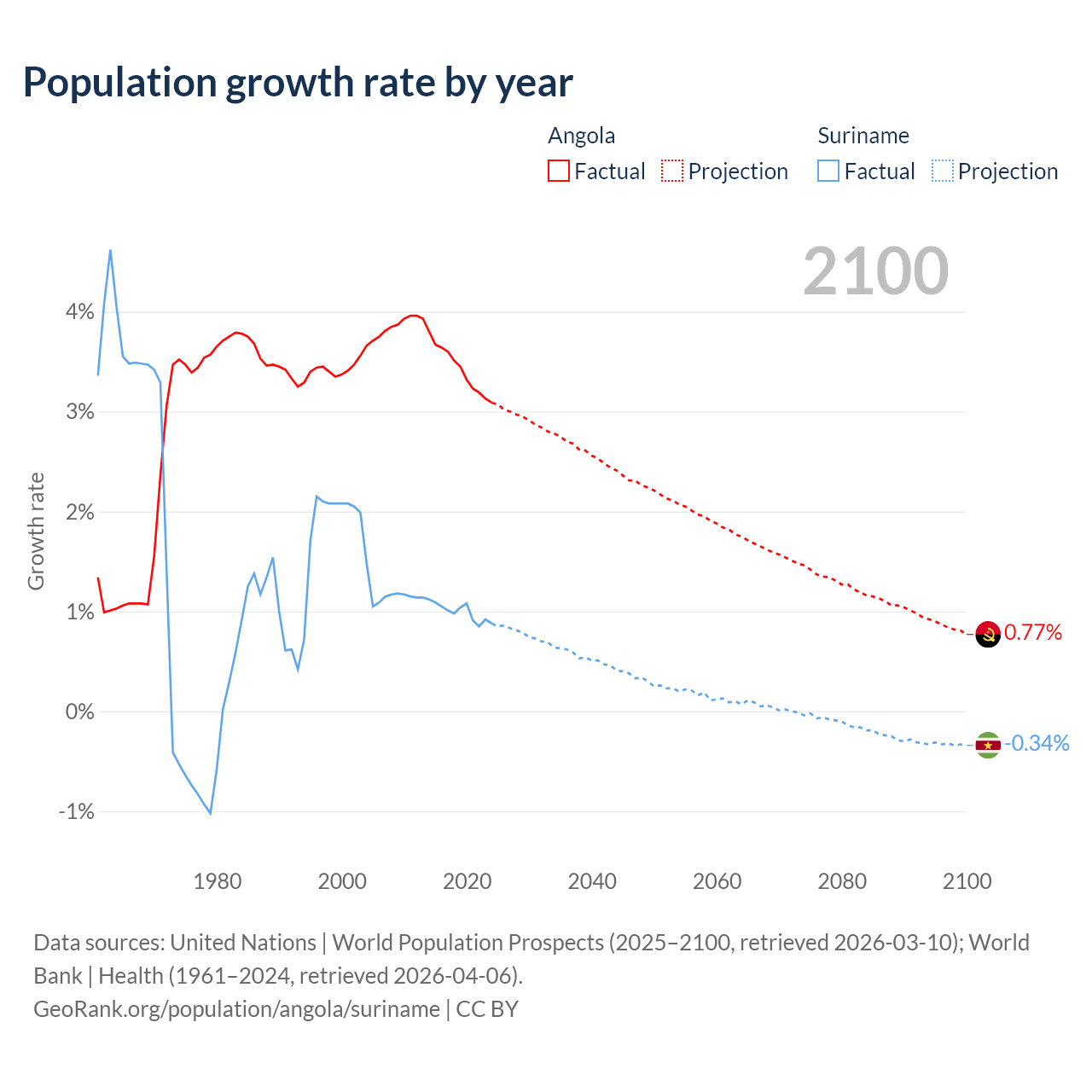 - For the last 10 years, Angola has had an average growth rate of +3.42% per year vs +0.99% in Suriname.