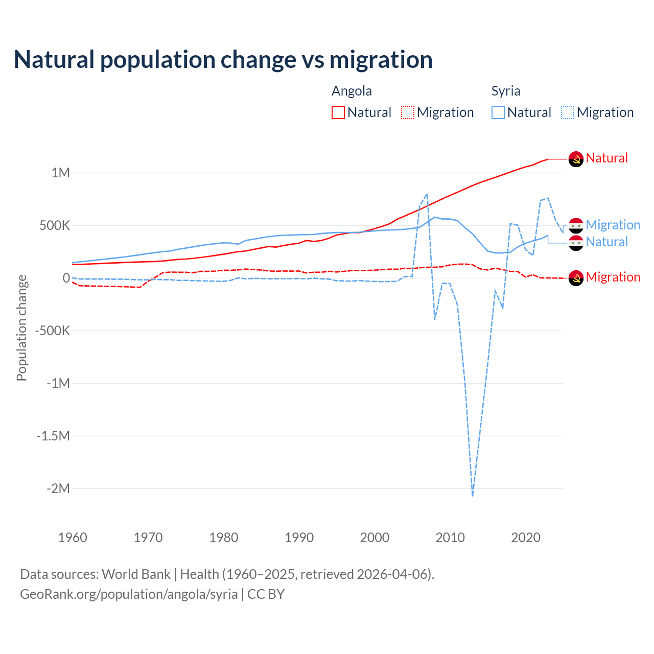 Over the last 10 years, 95.5% of the population change in Angola is from natural causes (a gain of 10,163,567 people) and 4.54% is from migration (a gain of 483,327 people). In Syria 91.3% is from natural causes (a gain of 3,047,621 people) and 8.72% is from migration (a gain of 291,069 people).