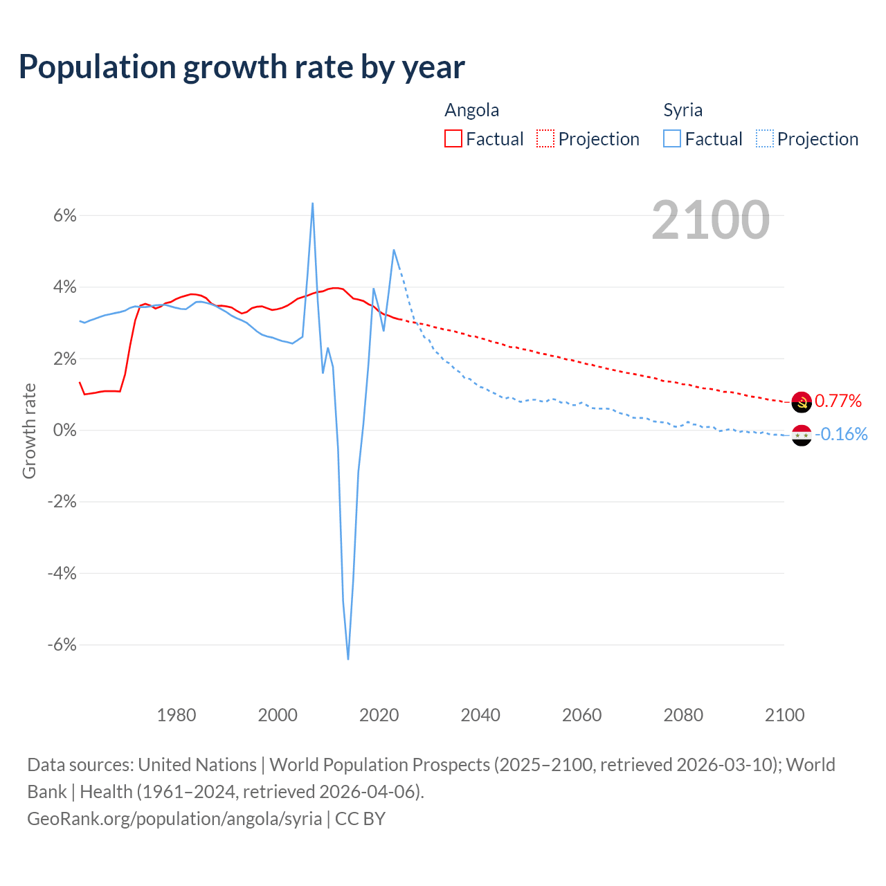 - For the last 10 years, Angola has had an average growth rate of +3.42% per year vs +1.25% in Syria.