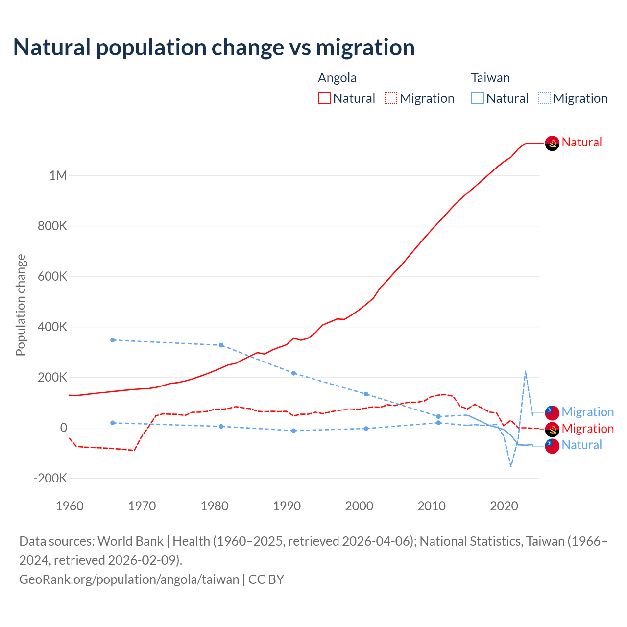 Over the last 10 years, 95.5% of the population change in Angola is from natural causes (a gain of 10,163,567 people) and 4.54% is from migration (a gain of 483,327 people). In Taiwan 56.7% is from natural causes (a loss of 57,467 people) and 43.3% is from migration (a gain of 43,884 people).