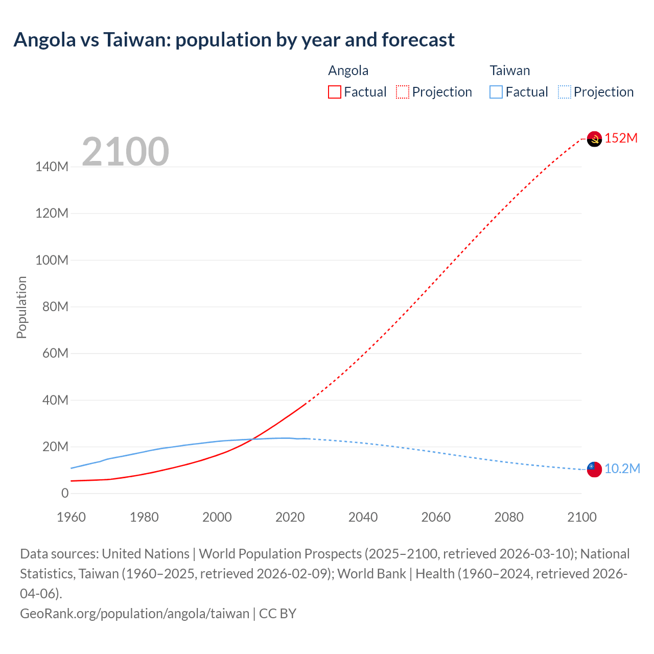Angola vs Taiwan: population by year and forecast