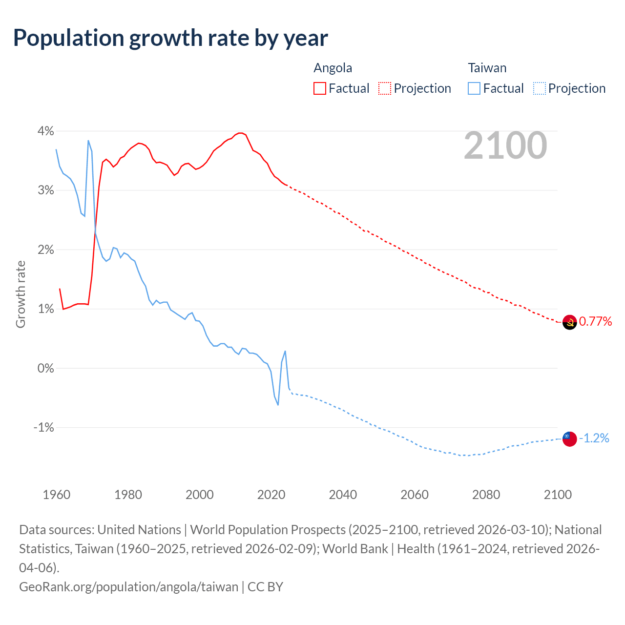 Data sources: World Bank | Health (1960–2024, retrieved 2026-04-06); United Nations | World Population Prospects (1960–2026, retrieved 2026-03-10); U.S. Census Bureau (1960–2025, retrieved 2026-02-08); National Statistics, Taiwan (1960–2025, retrieved 2026-02-09); Central Intelligence Agency (CIA) (2000–2019, retrieved 2026-02-20).
