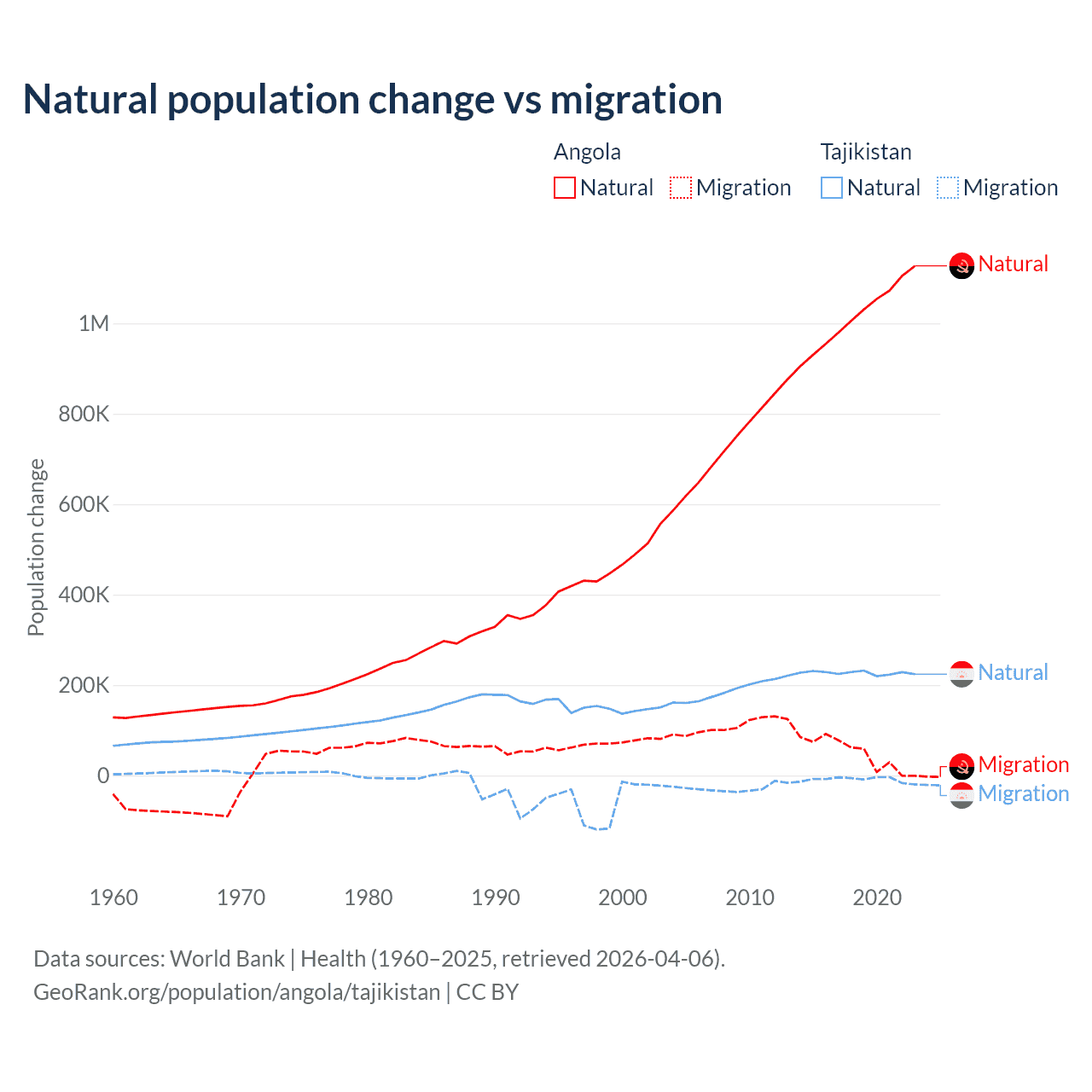 Over the last 10 years, 95.5% of the population change in Angola is from natural causes (a gain of 10,163,567 people) and 4.54% is from migration (a gain of 483,327 people). In Tajikistan 96% is from natural causes (a gain of 2,266,045 people) and 3.95% is from migration (a loss of 93,205 people).