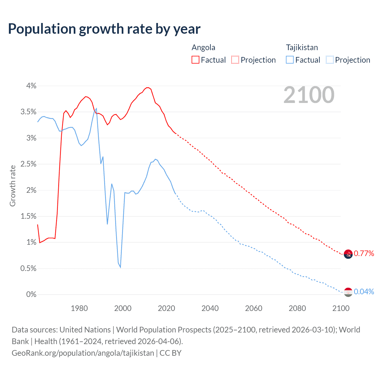 - For the last 10 years, Angola has had an average growth rate of +3.42% per year vs +2.33% in Tajikistan.