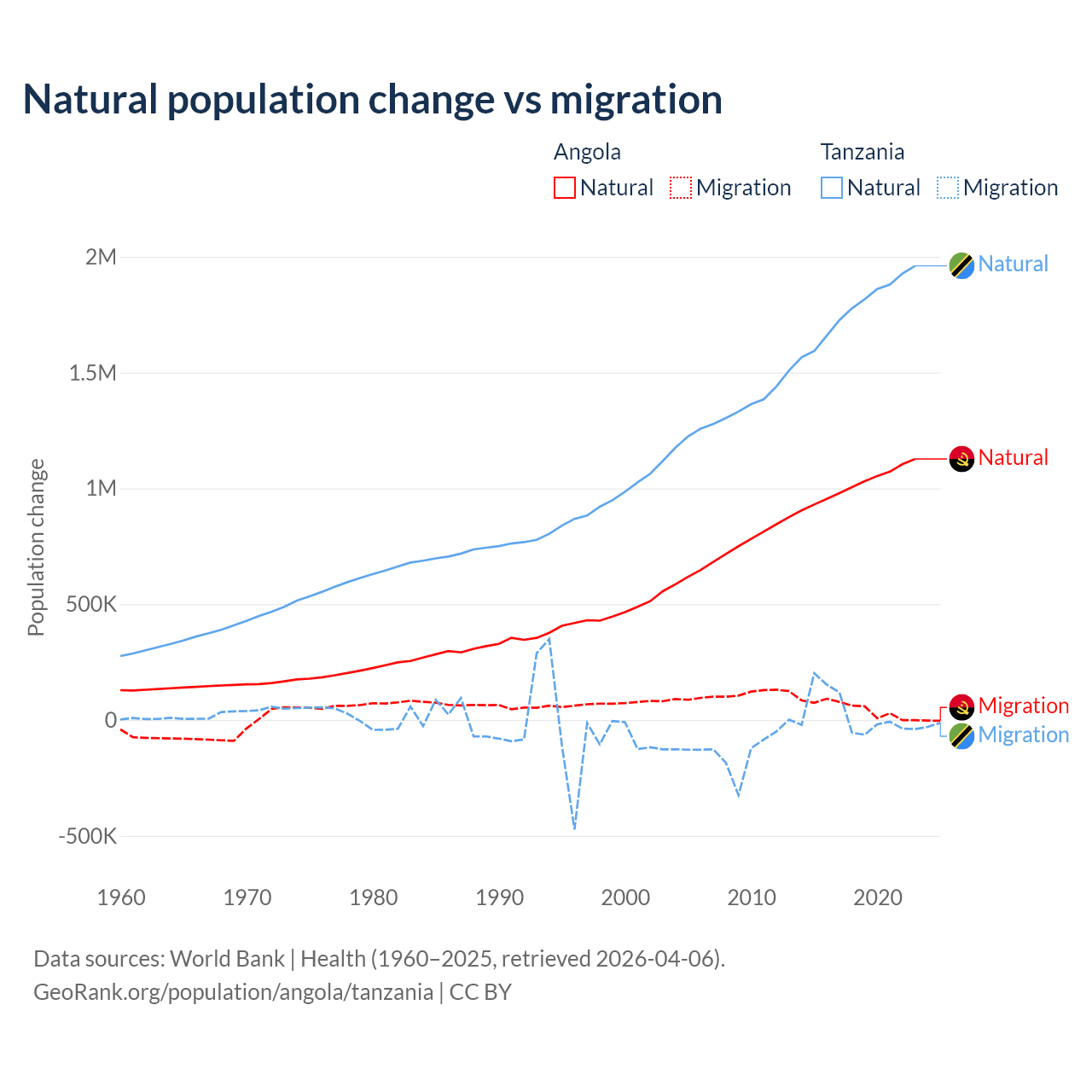 Over the last 10 years, 95.5% of the population change in Angola is from natural causes (a gain of 10,163,567 people) and 4.54% is from migration (a gain of 483,327 people). In Tanzania 98.7% is from natural causes (a gain of 17,769,541 people) and 1.27% is from migration (a gain of 229,466 people).