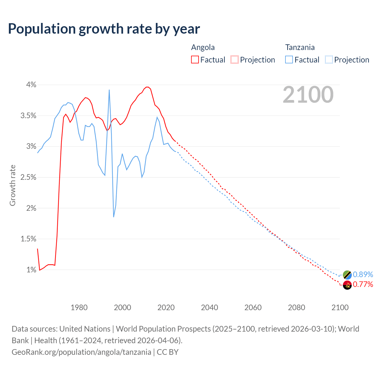 - For the last 10 years, Angola has had an average growth rate of +3.42% per year vs +3.13% in Tanzania.