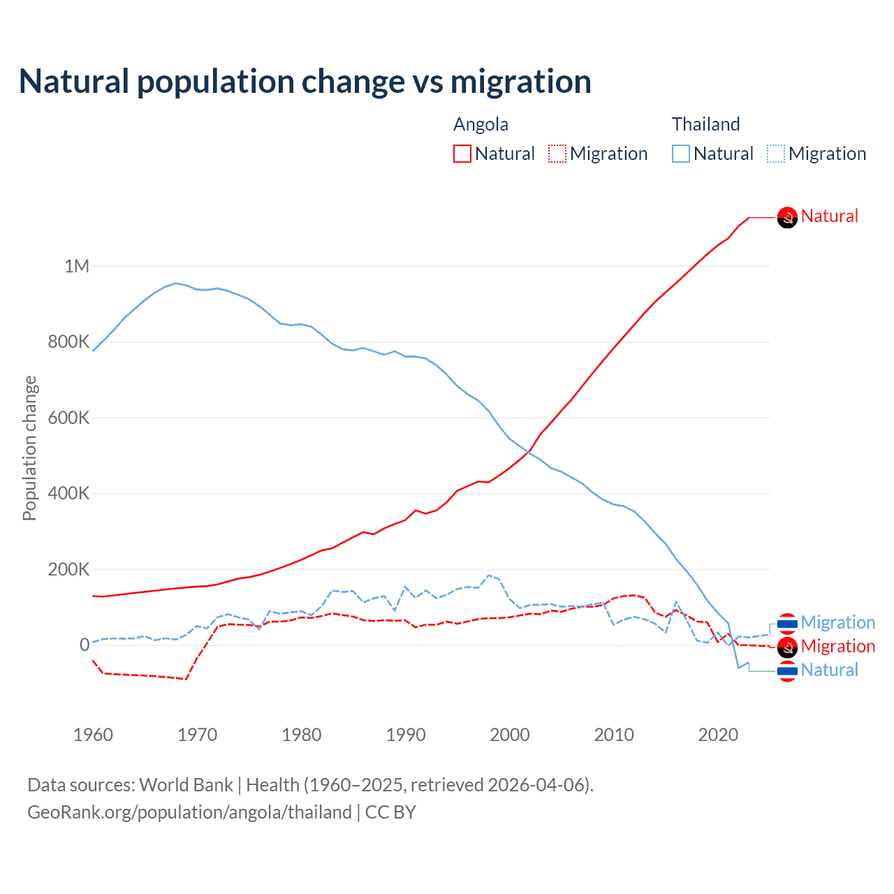 Over the last 10 years, 95.5% of the population change in Angola is from natural causes (a gain of 10,163,567 people) and 4.54% is from migration (a gain of 483,327 people). In Thailand 78.4% is from natural causes (a gain of 1,292,528 people) and 21.6% is from migration (a gain of 355,361 people).