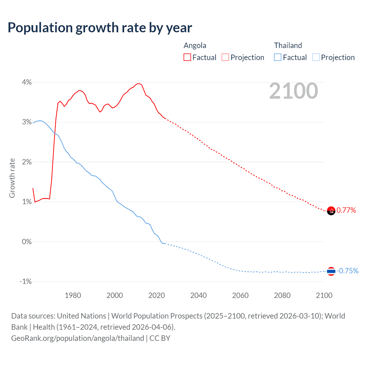 - For the last 10 years, Angola has had an average growth rate of +3.42% per year vs +0.23% in Thailand.