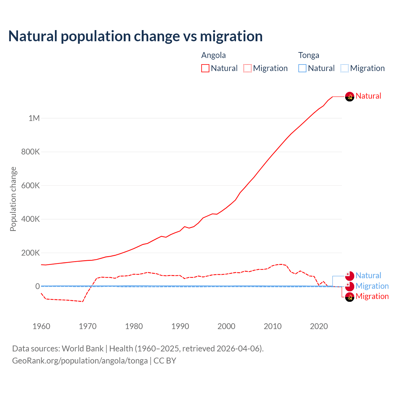 Over the last 10 years, 95.5% of the population change in Angola is from natural causes (a gain of 10,163,567 people) and 4.54% is from migration (a gain of 483,327 people). In Tonga 46.9% is from natural causes (a gain of 18,919 people) and 53.1% is from migration (a loss of 21,384 people).