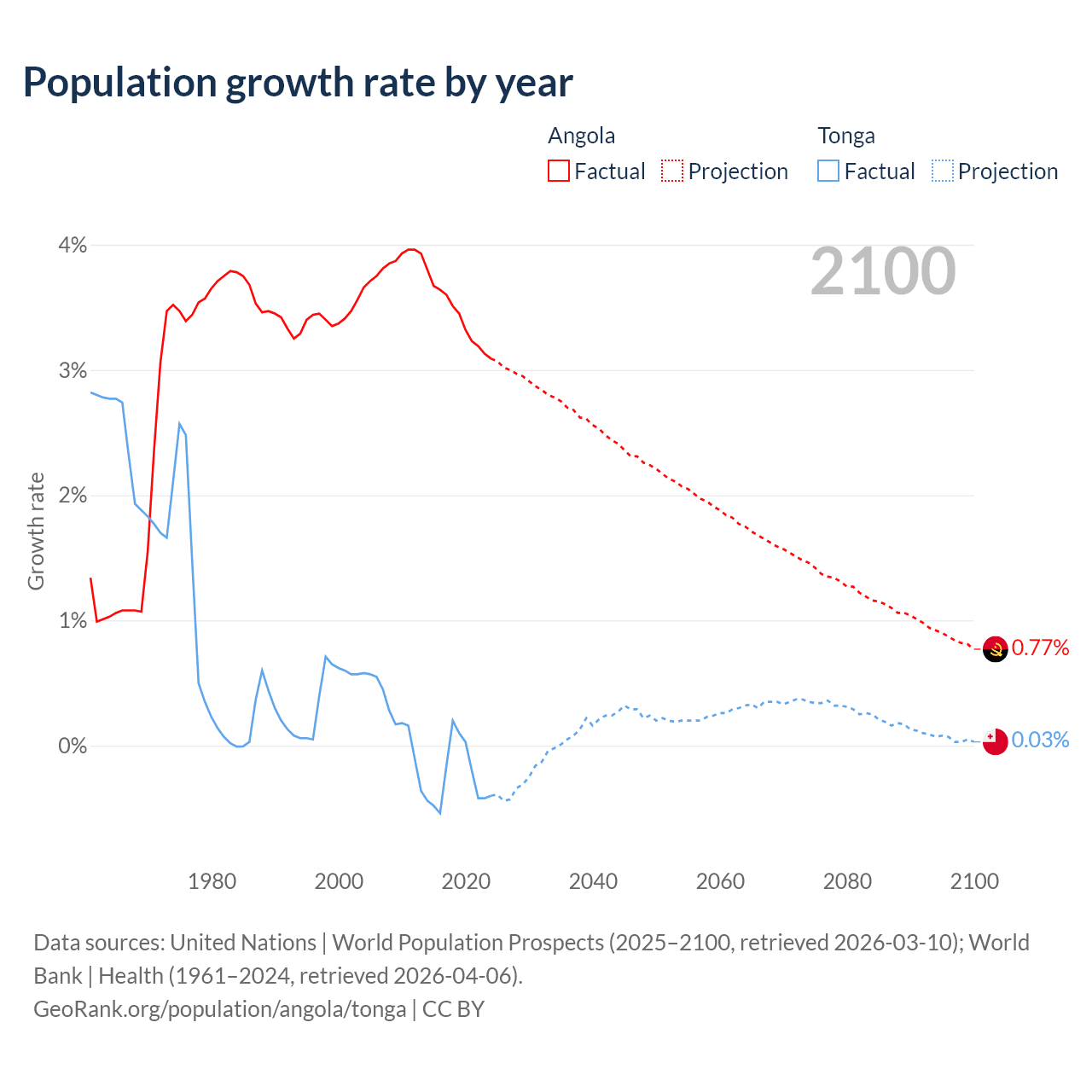 - For the last 10 years, Angola has had an average growth rate of +3.42% per year vs -0.25% in Tonga.