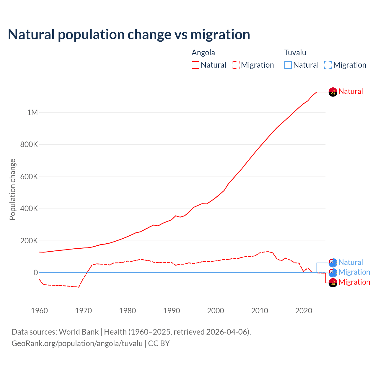 Over the last 10 years, 95.5% of the population change in Angola is from natural causes (a gain of 10,163,567 people) and 4.54% is from migration (a gain of 483,327 people). In Tuvalu 35.5% is from natural causes (a gain of 1,556 people) and 64.5% is from migration (a loss of 2,827 people).