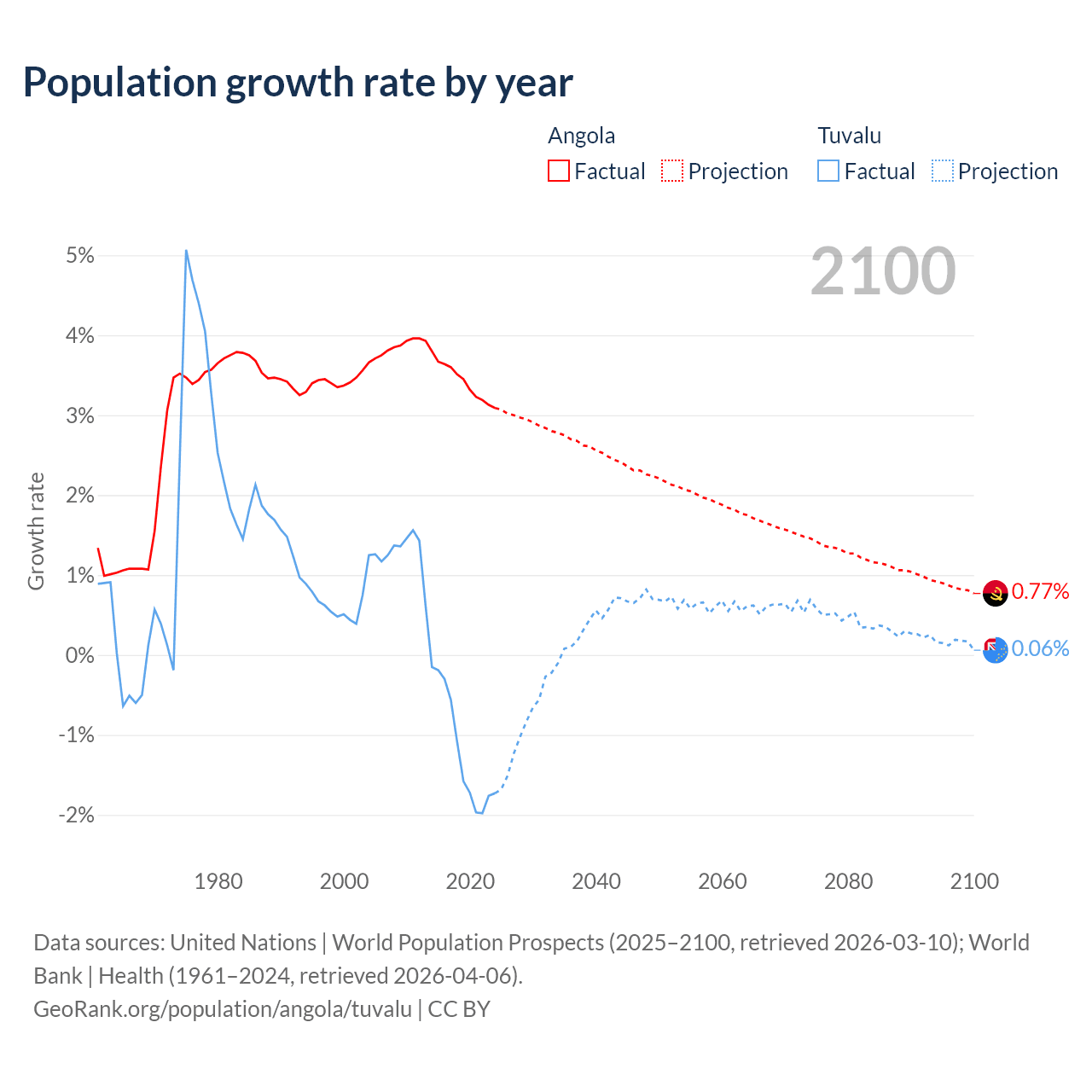 - For the last 10 years, Angola has had an average growth rate of +3.42% per year vs -1.19% in Tuvalu.