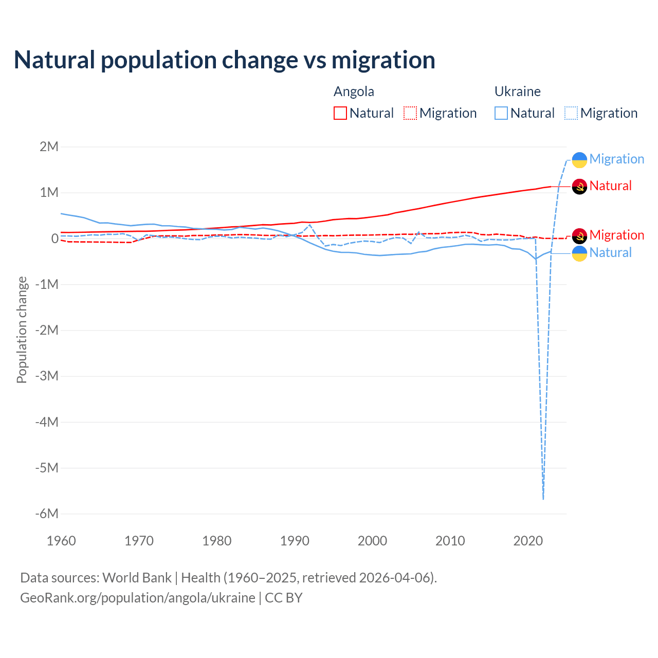 Over the last 10 years, 95.5% of the population change in Angola is from natural causes (a gain of 10,163,567 people) and 4.54% is from migration (a gain of 483,327 people). In Ukraine 28.2% is from natural causes (a loss of 2,435,153 people) and 71.8% is from migration (a loss of 6,198,995 people).