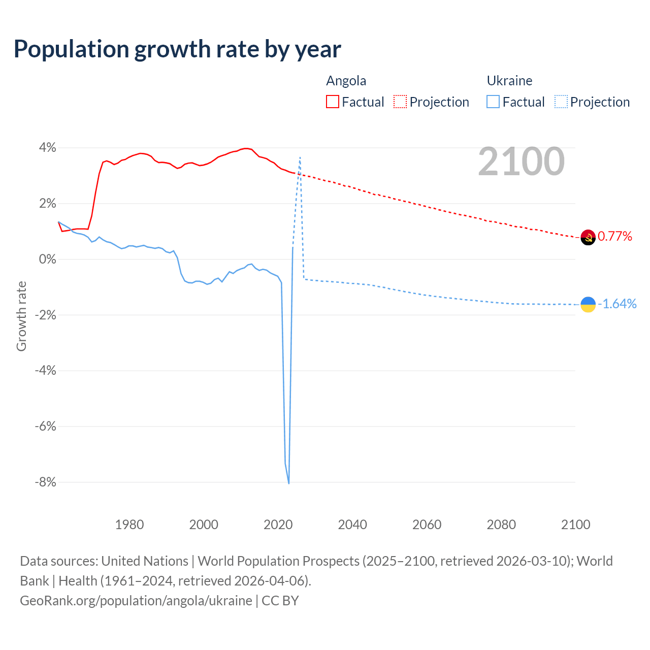 - For the last 10 years, Angola has had an average growth rate of +3.42% per year vs -1.74% in Ukraine.
