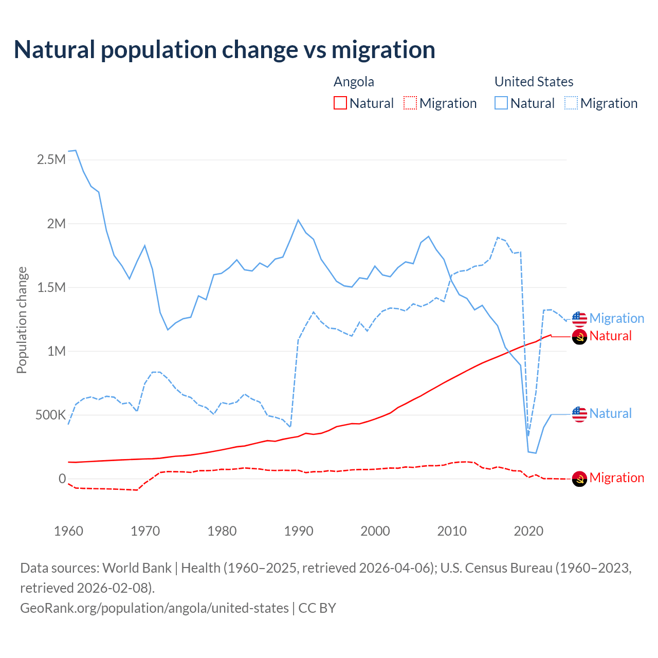 Over the last 10 years, 95.5% of the population change in Angola is from natural causes (a gain of 10,163,567 people) and 4.54% is from migration (a gain of 483,327 people). In the United States 35.8% is from natural causes (a gain of 8,005,866 people) and 64.2% is from migration (a gain of 14,334,286 people).