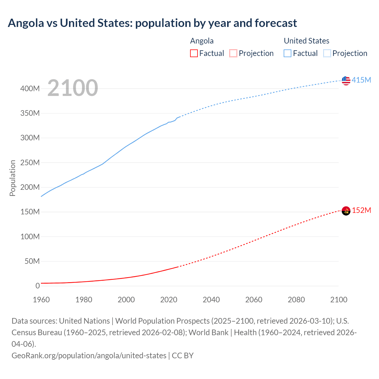 - Since 2006, the population of Angola has increased from 20M people to 40.6M (102.6% growth), while the United States has grown from 298M to 344M (15.3% growth).