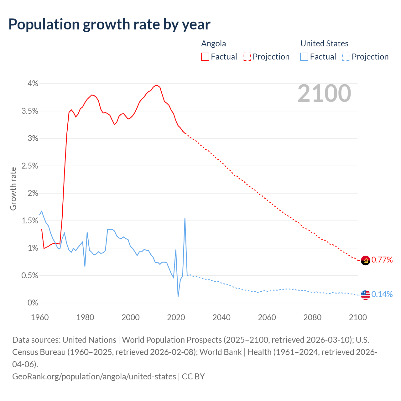 - For the last 10 years, Angola has had an average growth rate of +3.42% per year vs +0.65% in the United States.