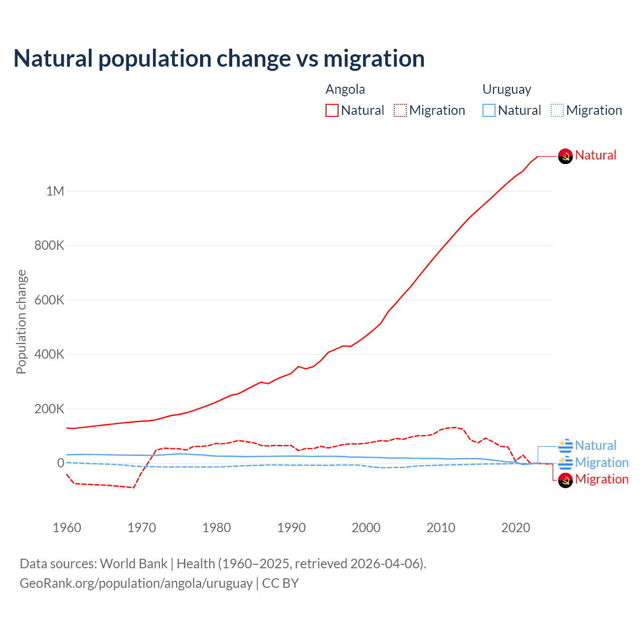 Over the last 10 years, 95.5% of the population change in Angola is from natural causes (a gain of 10,163,567 people) and 4.54% is from migration (a gain of 483,327 people). In Uruguay 70% is from natural causes (a gain of 64,303 people) and 30% is from migration (a loss of 27,501 people).