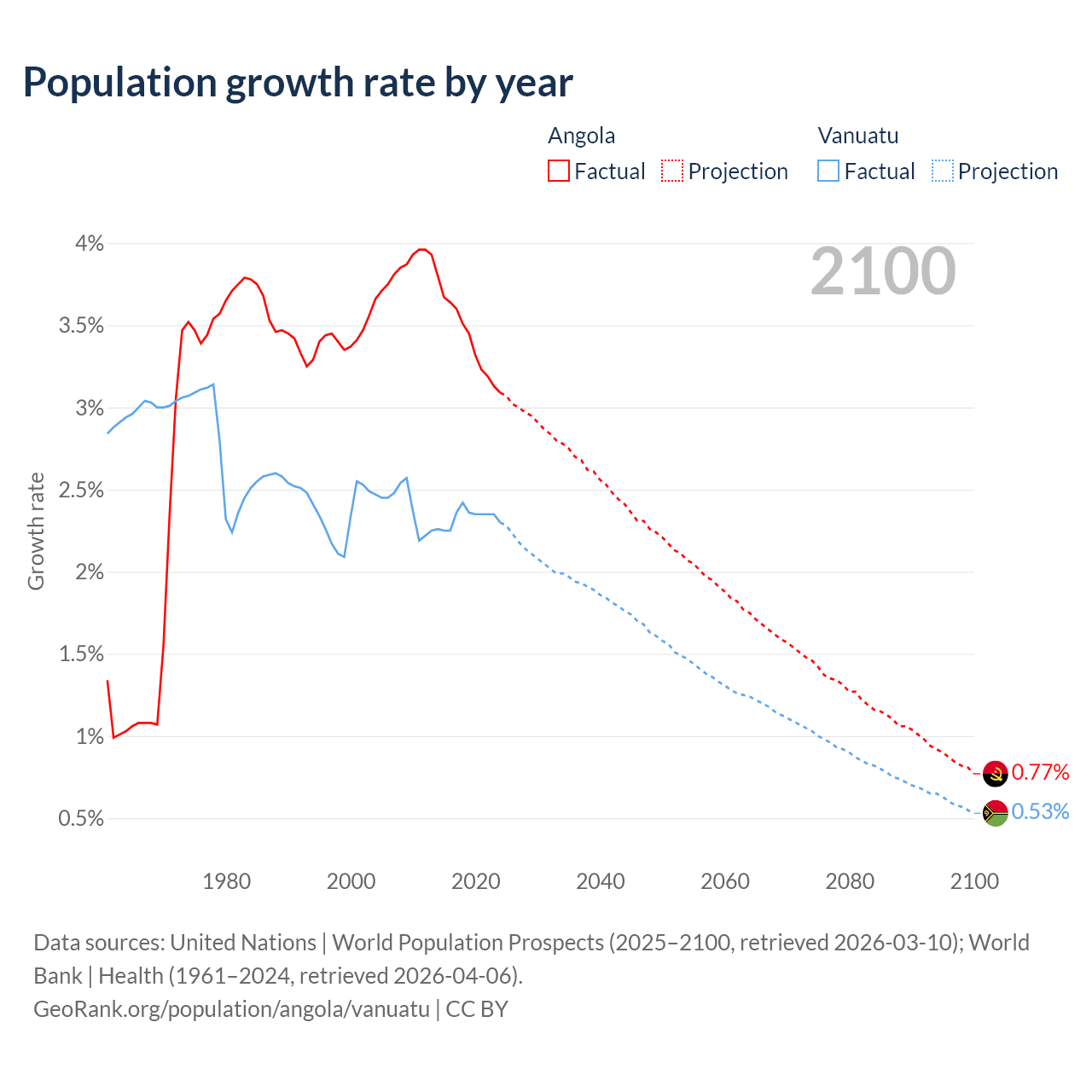 Angola vs Vanuatu: population by year and forecast