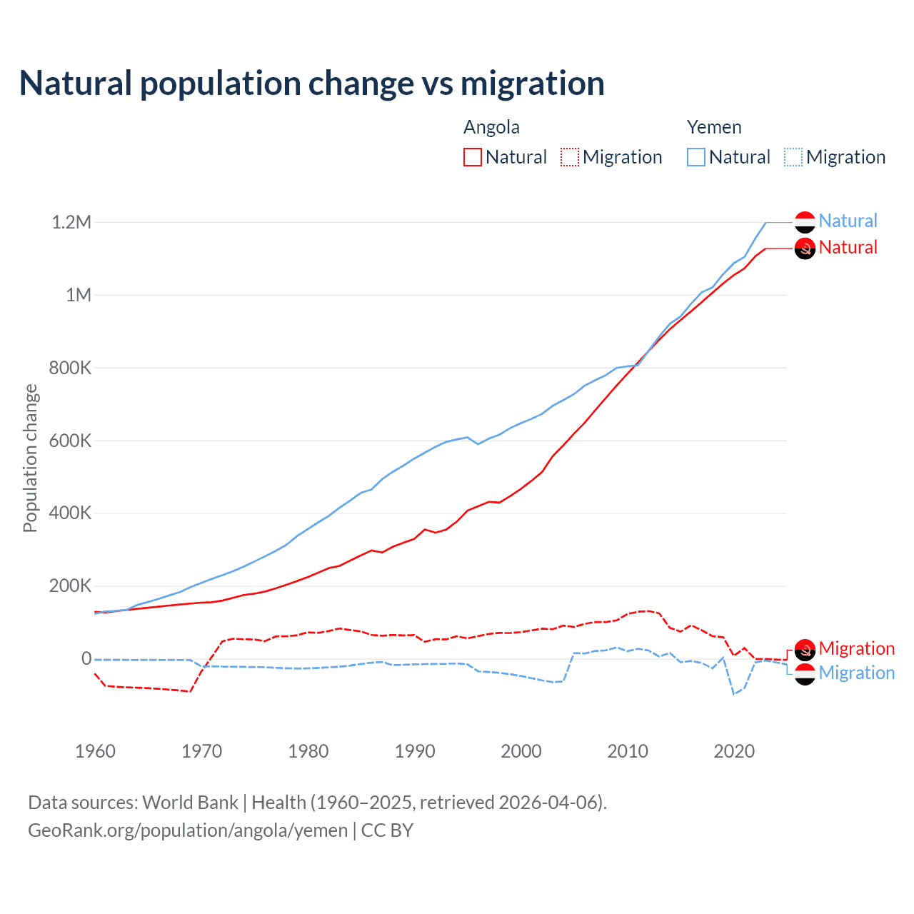 Over the last 10 years, 95.5% of the population change in Angola is from natural causes (a gain of 10,163,567 people) and 4.54% is from migration (a gain of 483,327 people). In Yemen 97.8% is from natural causes (a gain of 10,460,813 people) and 2.17% is from migration (a loss of 231,814 people).