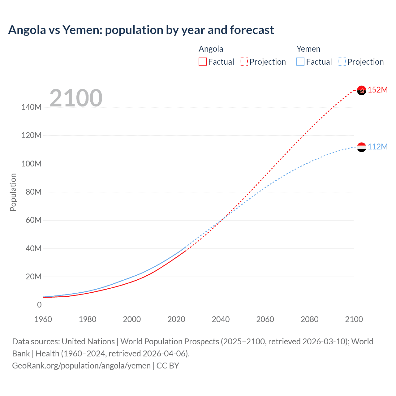 Angola vs Yemen: population by year and forecast